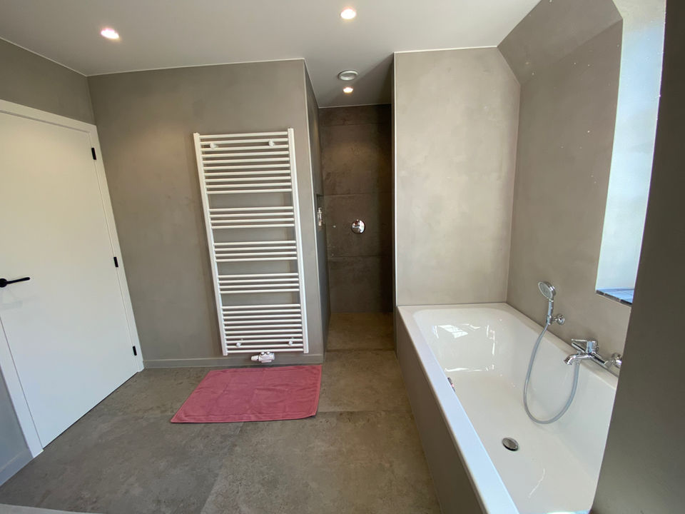 Een moderne badkamer met bad, lavabo en regendouche. Daarnaast is er een extra douchekamer met lavabo. Badlinnen zijn aanwezig.